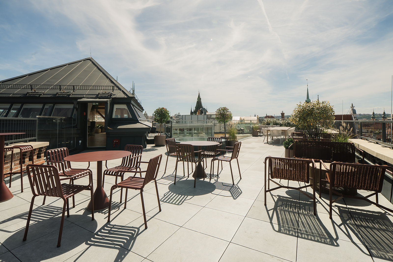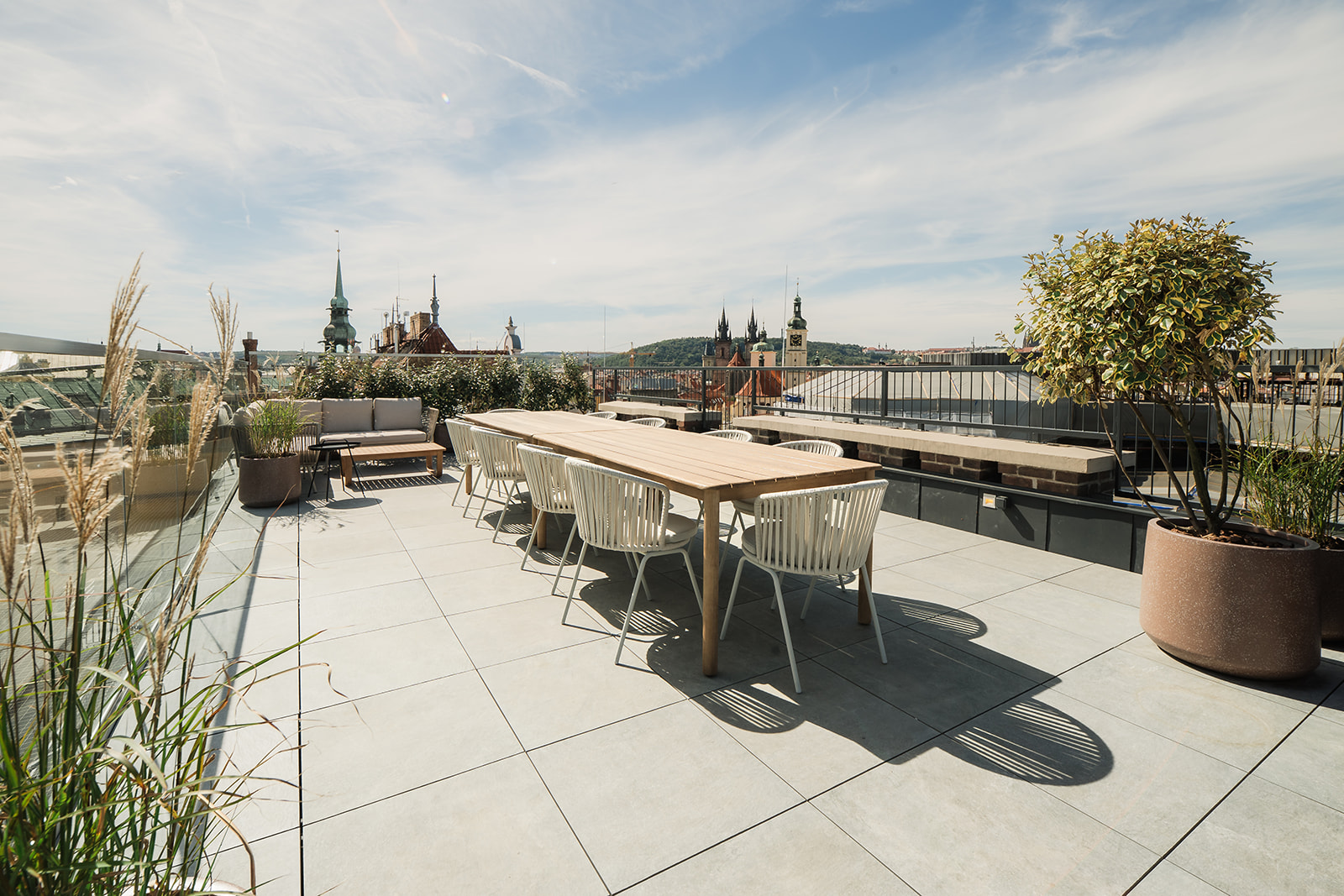 Představte si lahodnou chuť své oblíbené kávy na prosluněné terase s výhledem na Pražský hrad… Na Náměstí Republiky 7 si dechberoucí panorama Prahy ale nemusíte představovat, stačí jen vyjet výtahem na střechu. A pokud bude náhodou ošklivé počasí, můžete využít naši lounge s plně vybavenou kuchyňkou.